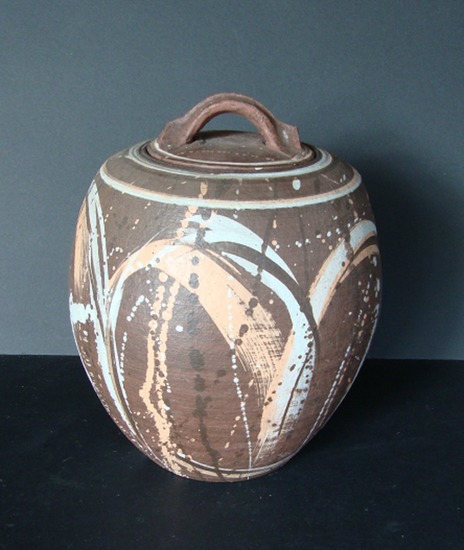 Dekselvaas met een organisch motief. Materiaal: zwartbakkend aardewerk. Techniek: gedraaid op de pottenbakkersschijf, de decoraties zijn organisch geïnspireerd met diverse engobes, door penselen en spatten aangebracht en dun mat geglazuurd en oxyderend gestookt op 1100 graden in een éénmalig stookproces