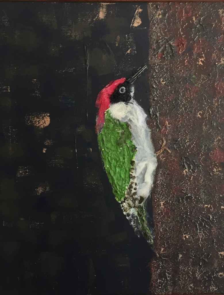 De lach van de Groene specht, die we dagelijks horen en allerlei rommeltjes uit mijn naaimand waren genoeg voor dit schilderij.