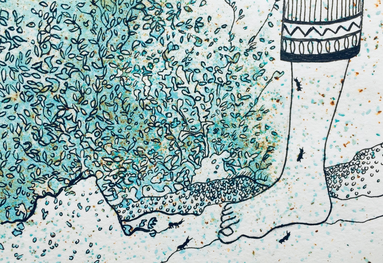 Mieren Insecten Voet Reiziger Natuur Avontuur Blauw Groen Fineliner Inkt Tekening