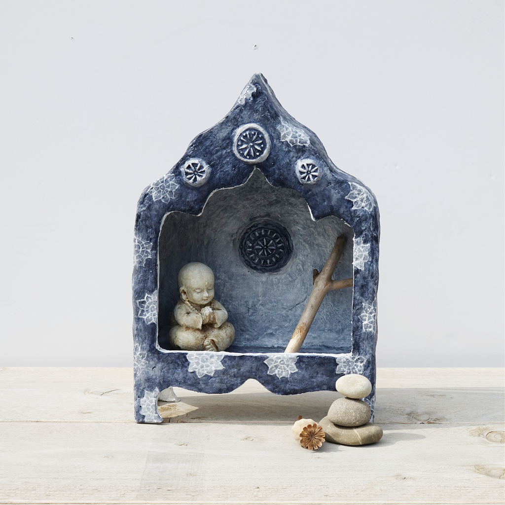 Een uniek handgemaakt kastje van papier mache, uitgevoerd in een diverse mooie tinten donker blauw (Paynes Gray) en zacht witte light blauwe bloemdecoratie. Dit altaarkastje kan zowel staand als hangende gebruikt worden, het heeft een eenvoudige gat in de achterzijde voor een haakje of een spijker. Dit papier mache kastje is heel erg sterk, maar ook erg licht van gewicht en heeft bovendien een mooie structuur die ervoor zorgt dat de blauwe tint bijna wel fluweel lijkt. Dit is een geweldige plek om kleine schatten in te bewaren of om iemand te gedenken. De opening van het kastje is speciaal ontworpen zodat er veel ruimte is voor je speciale spulletjes. Kan zowel hangend als staand gebruikt worden Verkocht