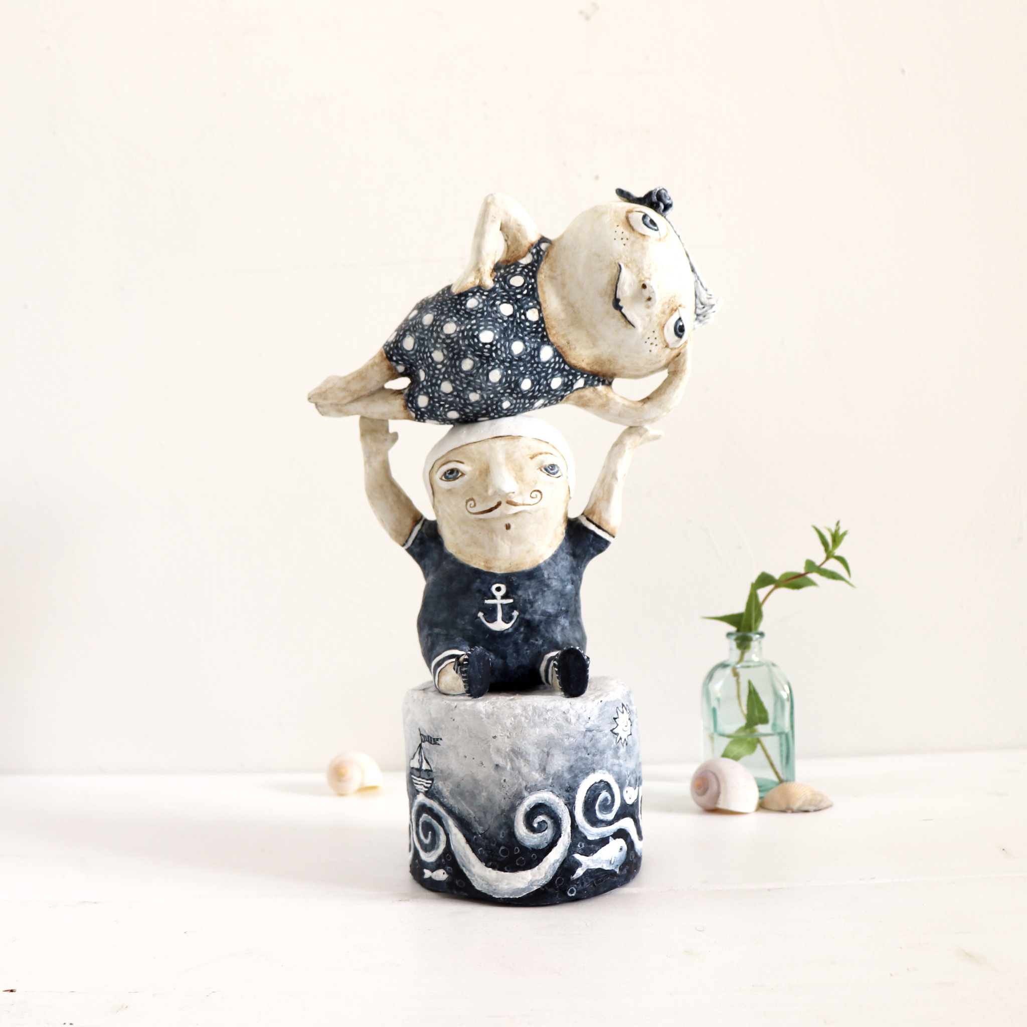 ''Darling, just get me a little bit closer to the sun!'' And so he picked her up to get her a little bit closer to the sun! Het is niet zo heel erg moeilijk om verliefd te worden op deze twee eigenwijze figuren! Ze blijven fascinerend om naar te kijken en voor je het weet zul je allerlei verhalen over ze verzinnen! Dit bijzondere handgemaakte beeldje is gemaakt van een combinatie van papier maché en klei. Zelfs de sokkel is gemaakt van papier mache. Deze sculptuur is gemaakt met veel zorg en liefde en met een goed oog for detail! De sterkte man draagt kleine, hippe slippers en de vrouw heeft een mooie roos in haar haar. Ik hoop dat je net zo van dit stukje kunst gaat houden, als dat ik het geweldig vond om te maken! Hoogte: 33 cm Breedte: 21 cm Diepte: 12 cm