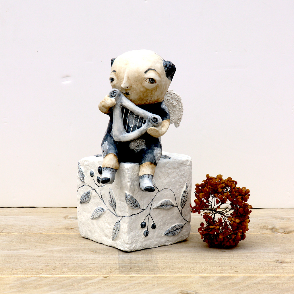 Angel vindt het heerlijk om op zij harp te spelen. En terwijl hij muziek maakt kijkt hij vanaf zijn sokkel naar de wereld... Dit kleine beeldje is gemaakt van een combinatie van papier maché en klein. Angel heeft een beetje een fout kapsel en twee kleine witte vleugels op zijn rug. De sokkel is mooi versierd met blaadjes en besjes, die erg goed passen bij de muziek die Angel op zijn harp maakt. Dit kleine beeldje is helemaal met de handgemaakt en met veel liefde. Bovendien is alles met de handbeschilderd. Misschien heb je al jaren naar deze engel gezocht? Hoogte: 25 cm Breedte: 14 cm Diepte: 15 cm