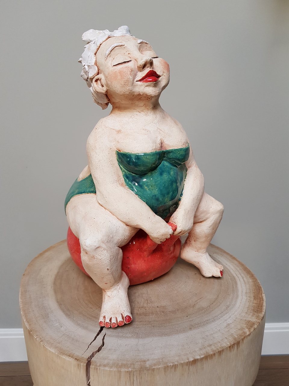 Vrouw met skippybal rood. Voor de afwerking is glanzende glazuur gebruikt