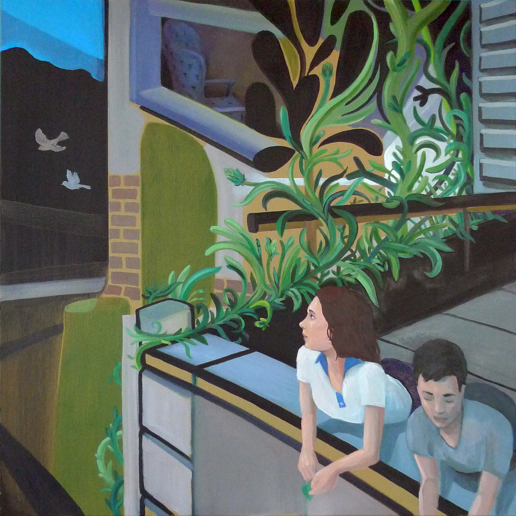 Meisje Jongen Vogels Uitzicht Planten Gebouw Balkon Melancholie