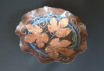 Blauwe schaal met abstract, op bladeren geïnspireerd motief. Materiaal: zwartbakkend aardewerk. Techniek: gedraaid, gedecoreerd met engobes, dun mat transparant geglazuurd, éénmalige oxyderende stook op 1100 graden.