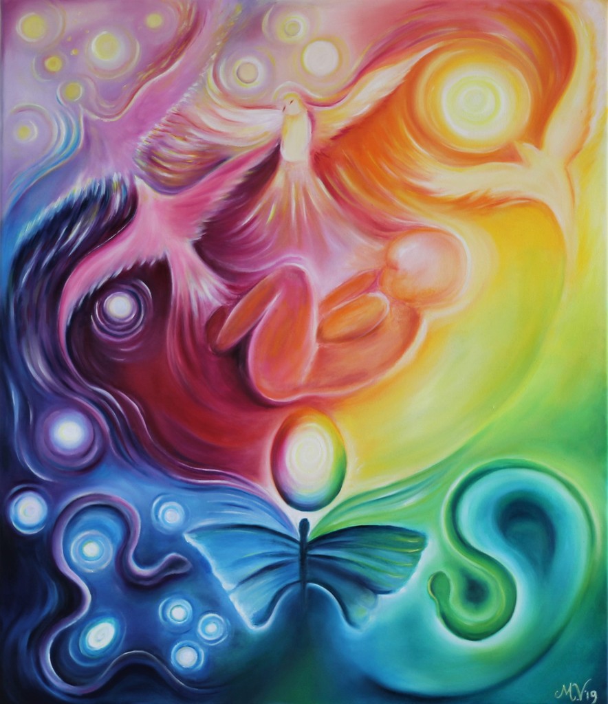 Dit schilderij gaat over geboren worden als mens in de wereld. Er is een hoop symboliek in te vinden. Het bestaat uit drie delen: onder de benedenwereld waar je 2 slangen ziet, een vlinder en daarboven een ei. Naast de linkerslang zijn llichtbolletjes/zaadjes te zien die nog verborgen liffen in het donker. Dit staan voor creatie en schepping, conceptie en transformatie. In het midden zie je een baby/foetus, dat gaat over de mens die (her)boren wordt. De mens die meer mens wordt wanneer hij levenservaringen opdoet en naarmate zijn bewustzijn meer groeit. Naar boven zijn links 2 vogels te zien die staan voor het mannelijke en vrouwelijke deel in ons. Samen vliegen ze in liefde naar de hemel. In het midden de vredesduif die het grotere geheel overziet en de Grote Geest vertegenwoordigt, waar wij allemaal uit bestaan. En rechts zie je een soort vliegend wezen in de zon vliegen; het zonnewezen in ons. Het schilderij laat een innerlijke reis en transformatie zien, de verschillende lagen in ons menszijn en groei. a