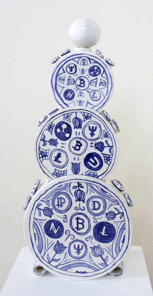 de serie tulpenvazen verwijst naar dergelijke vazen uit de 17de eeuw. hoewel de tulpenmanie pas een eeuw later plaatsvond worden ze er mee in verband gebracht. ik verbeeld "de waan van de dag", hier de cybercoin-hype, zoals bitcoins. de vaas bestaat uit drie gestapelde muntvormige vazen met de logos van verschillende.cryptocoins.