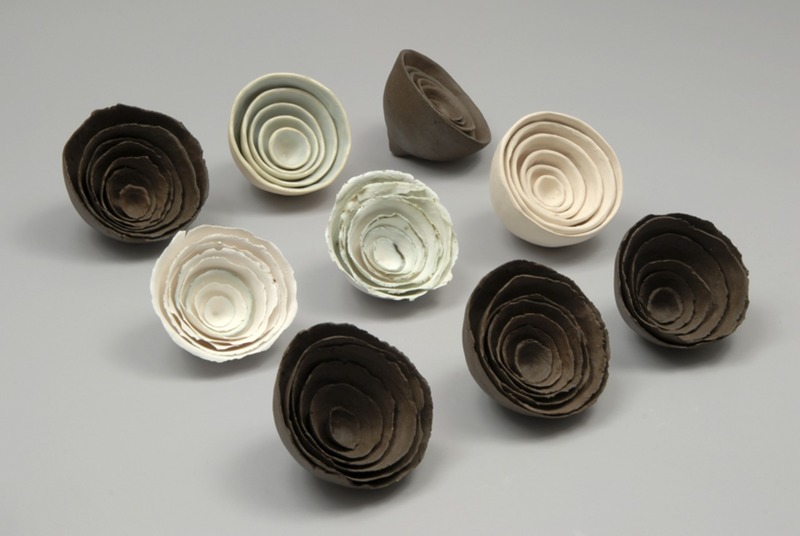 Objecten die in elkaar nestelen. Sommige zijn heel teer, andere kunnen tegen een stootje. Een collectie nesten van handgevormde bruin en wit steengoed en gegoten porcelein.