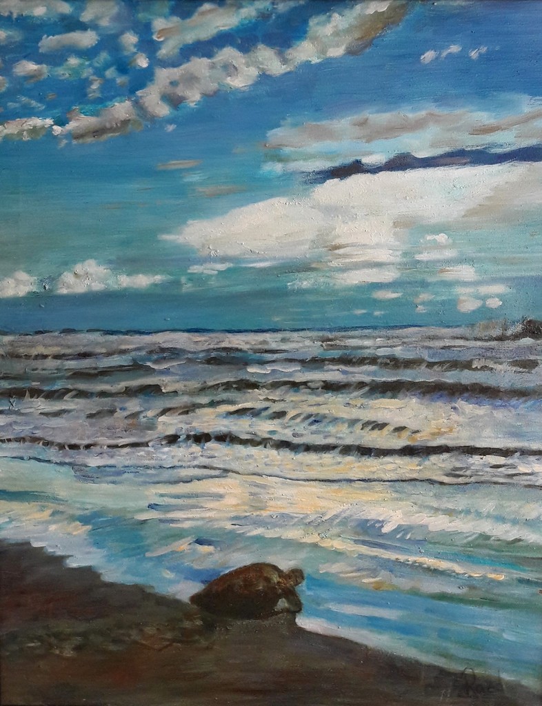 Schildpad aan zee strand (classic verf uit pigment medium en olie)