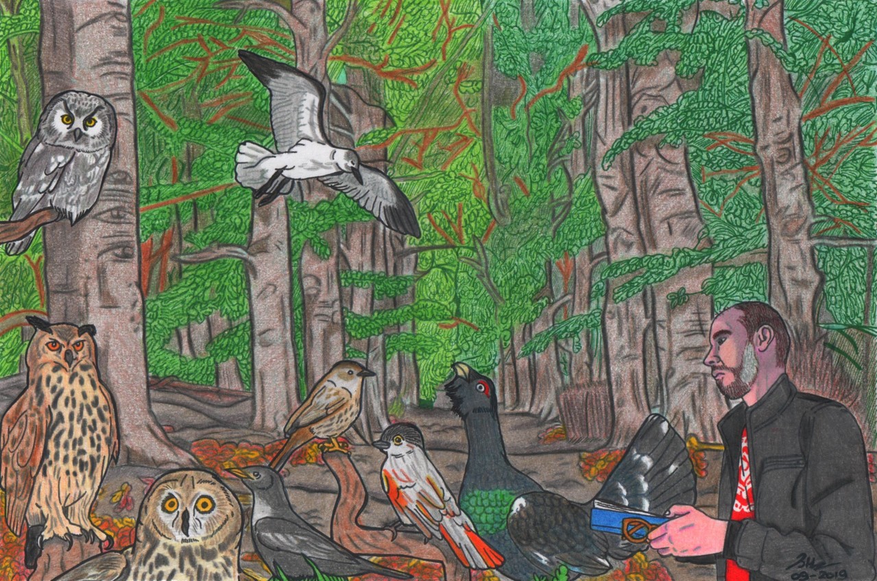 'Scott en de vogels' Mezelf getekend in het bos met verschillende vogelsoorten. Met de Ruigpootuil, Velduil, Oehoe, Beflijster, Heggemus, Taigagaai, Lachmeeuw en de Auerhoen.