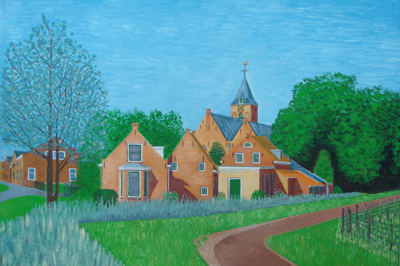 Vanaf het Rien Poortvlietpad nabij de Dorpsstraat in Kethel is een mooi uitzicht op het kerkdorp Kethel. Het dorpsgezicht is met olieverf op paneel geschilderd.