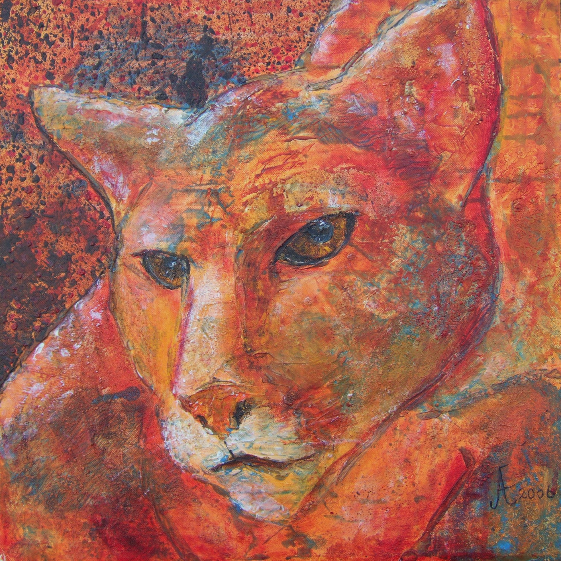 Met afwisselend dun stromende verf en dikke pasteuze verflagen met toevoeging van o.a. zand is uiteindelijk de poema ontstaan.