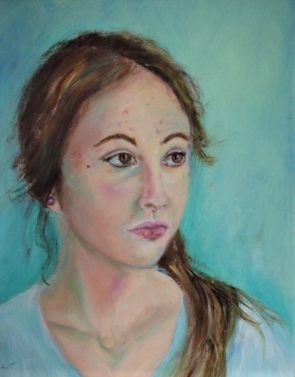 model pubermeisje sofie 14 jaar op paneel mdf. Olieverf. In lijst.