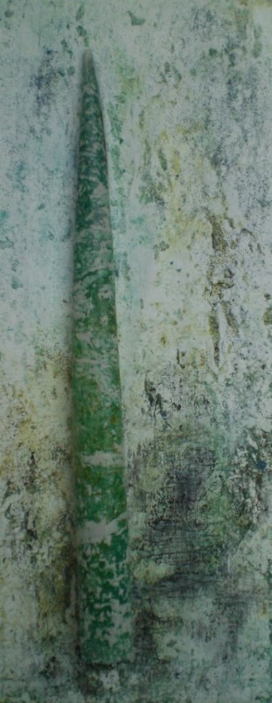 Verhard kaasdoek op canvas bewerkt met acrylverf, zwarte conte.