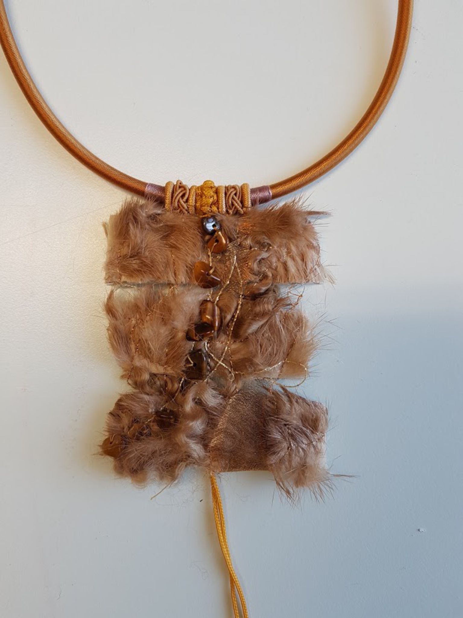 Halssieraad van bont, kant, leer, kraaltjes en draad
