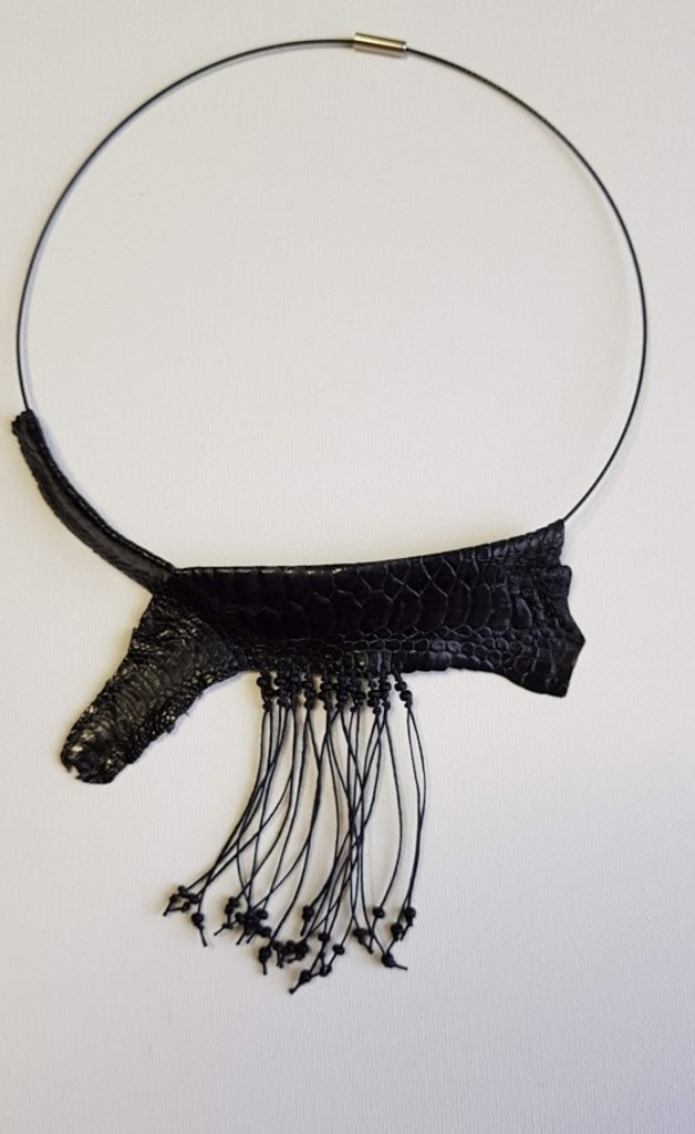 Sieraad van zwart kippenpootleer aan spang