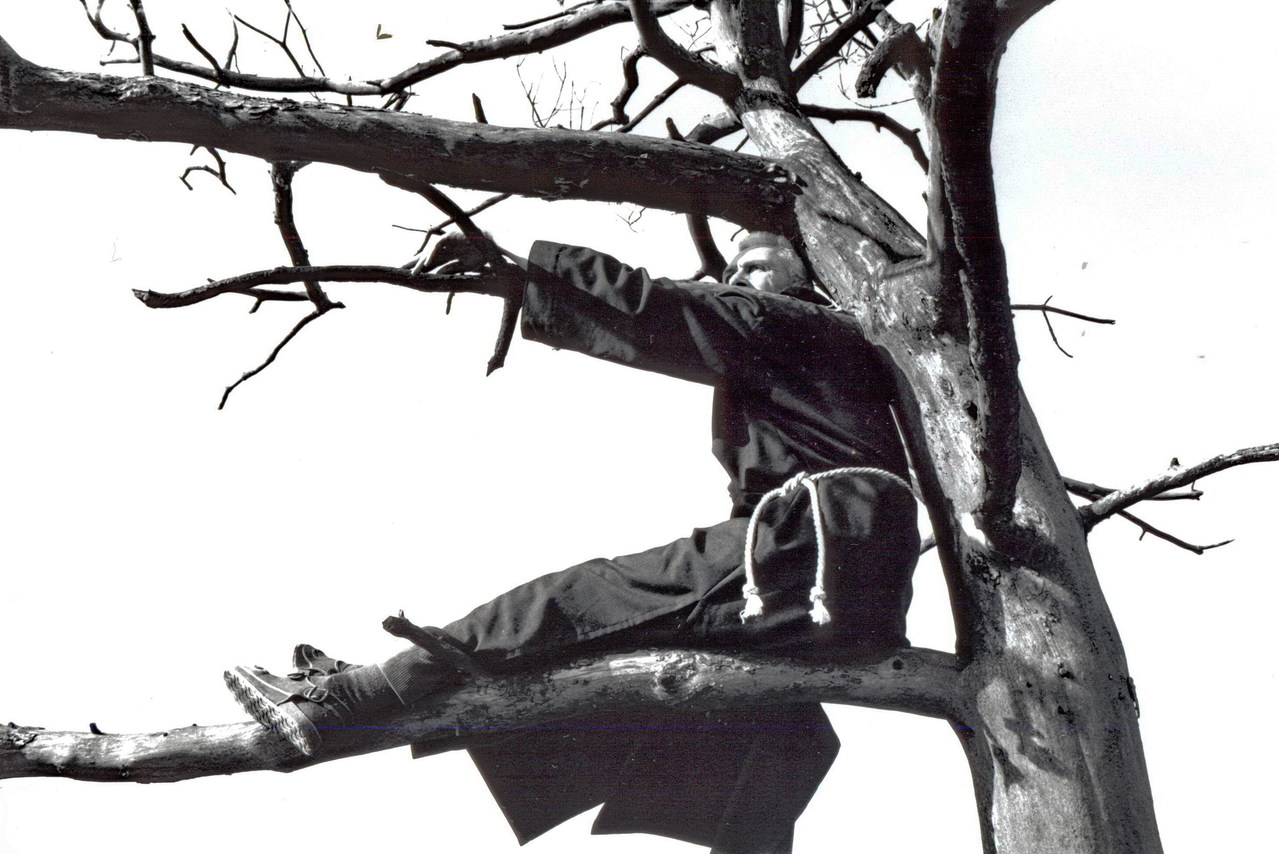 scene monnik in boom (locatie Kootwijkerzand)