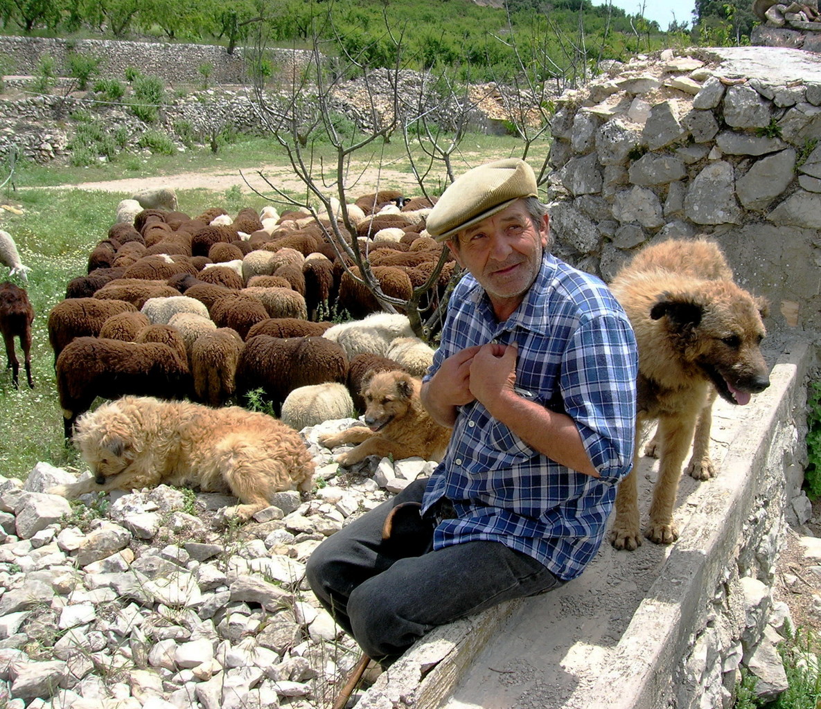 Een schaapsherder met zijn schapen en schaapsherdershonden (Spanje)