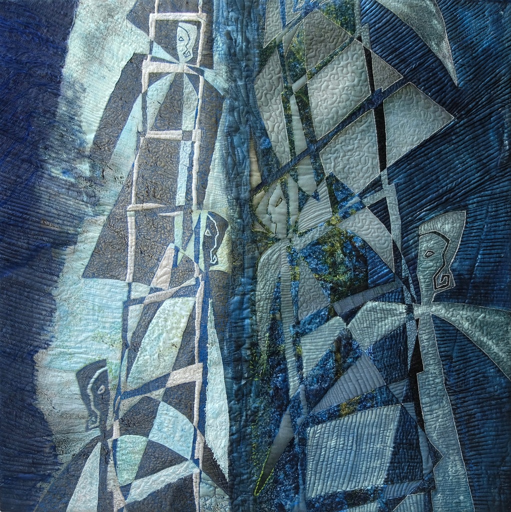 Engelen bewegen tussen hemel en aarde. Techniek: mixed media, fotografie, textiel, geborduurd, beschilderd