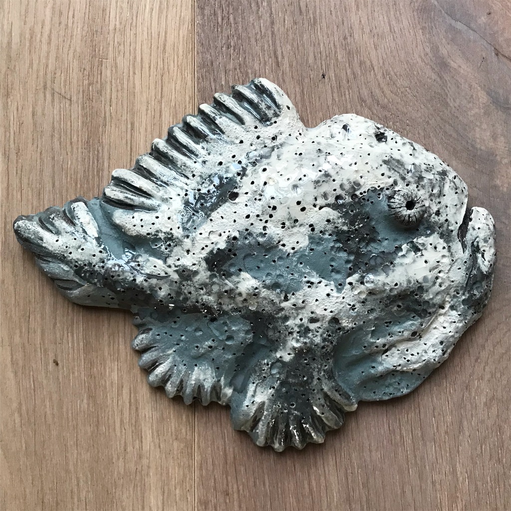 Een handgevormde koraalvis met veel textuur en kleur varieteit. Het is plat aan de achterkant en heeft daar een uitholling, zodat het aan de muur gehangen kan worden. Het is een handgevormde sculptuur van donkerbruin bakkende fijne chamotte klei. Het is bewerkt met engobes en witte kleislib In de oven is de vorm bisquit gebakken tot een temperatuur van 1000 graden celcius, daarna deels transparant geglazuurd en afgebakken op 1040 graden celcius. Een frogfish (of hengelvis in het Nederlands) leeft in tropische wateren op of in de buurt van koraal. De vis is erg moeilijk te zien als het dezelfde kleur heeft als het koraal. Hij zou een hengeltje op de kop moeten hebben, waarmee hij prooi lokt, maar meestal is deze verdwenen, omdat die erg kwetsbaar is.