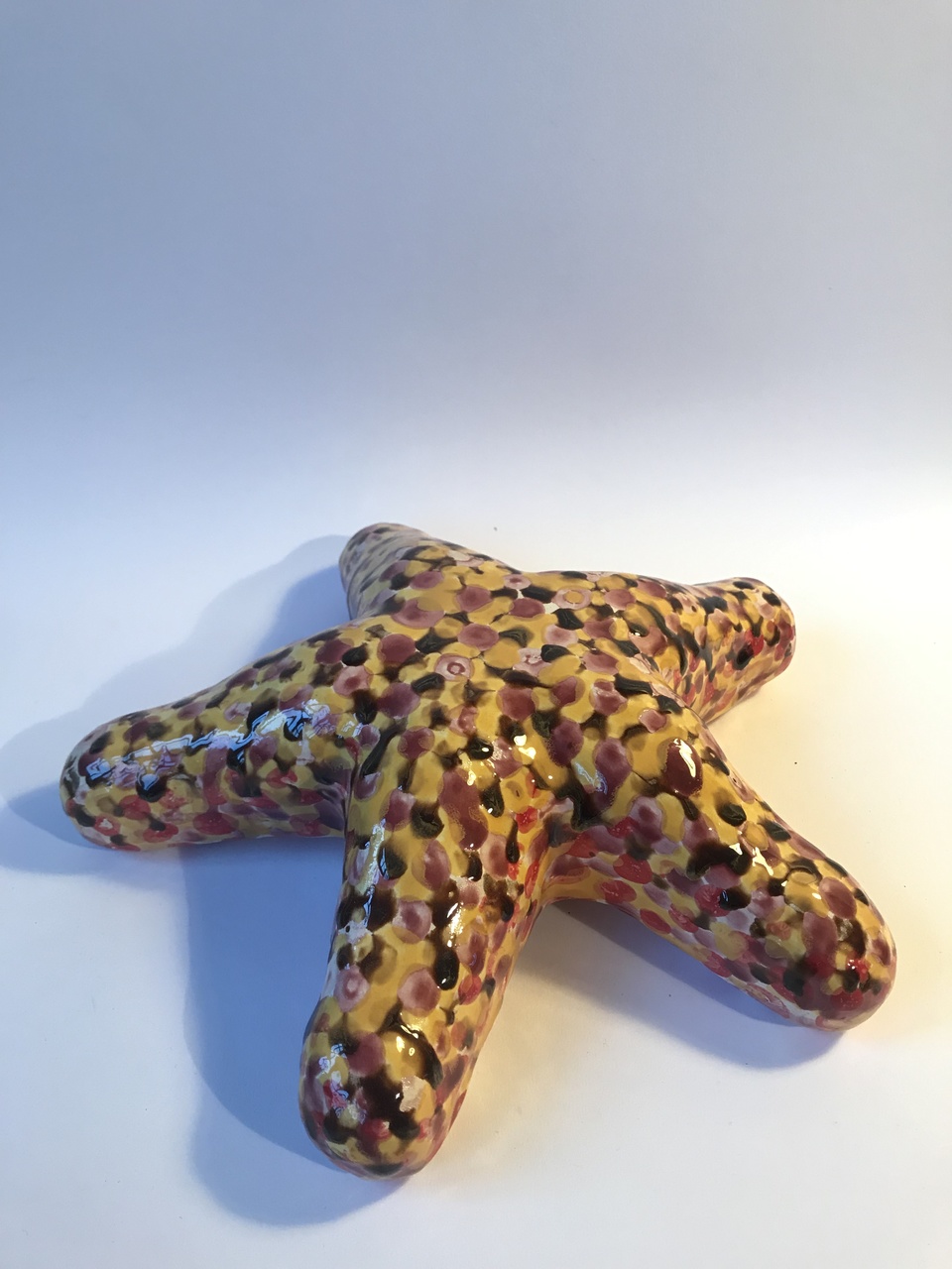 Grote veelkleurige zeester, voornamelijk roodkleuren en groen. De vorm is hol en daardoor niet erg zwaar. In het midden komt de vorm los van de ondergrond. Je kan de vorm op meerdere manieren presenteren; liggend op een odnergrond, hangend aan de muur of gestapeld in combinatie met meerdere zeesterren. Gebruikmakend van een zelfgemaakte gipsen mal heb ik deze vorm gemaakt. Het is bewerkt met engobes, bisquit gebakken op 1000 graden celcius en daarna geglazuurd en opnieuw gebakken op 1040 graden gebakken.