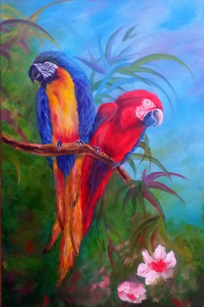 Olieverfschilderij van papegaaien op doek. Formaat staand 40 x 60 cm in lijst