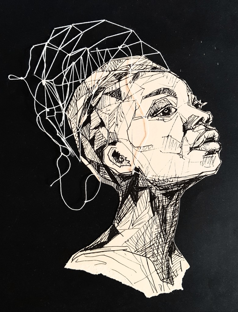 Combinatie van tekenpen, 'naald en draad' en collagetechniek op papier. Te koop (inclusief lijst).