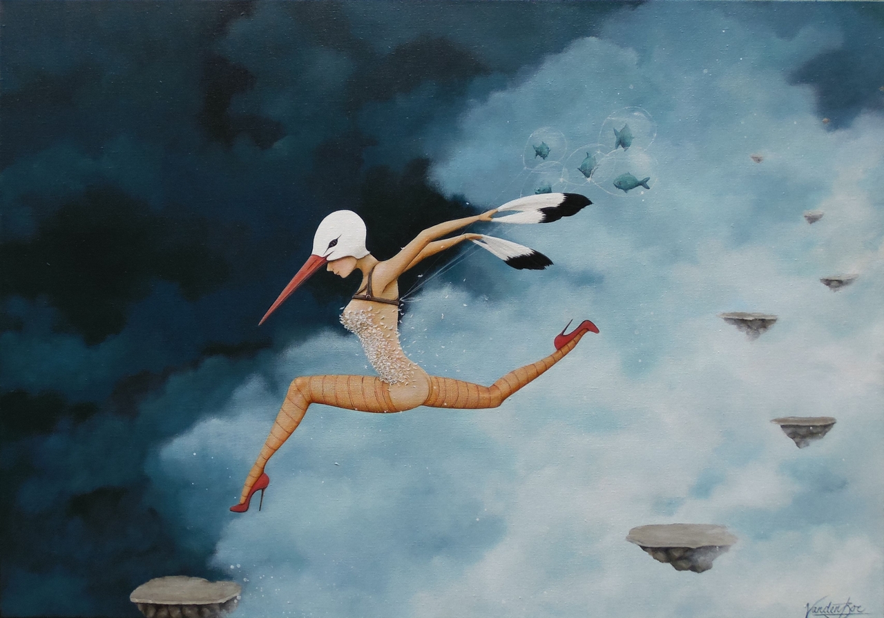 Sold Schilderij van een vogelvrouw rennend door de lucht met ballonnen gevuld met vissen. Afmeting: 70 x 100 cm.