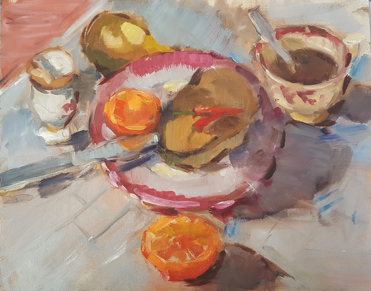 De wanorde van de verlate ontbijttafel is zo leuk om te schilderen!