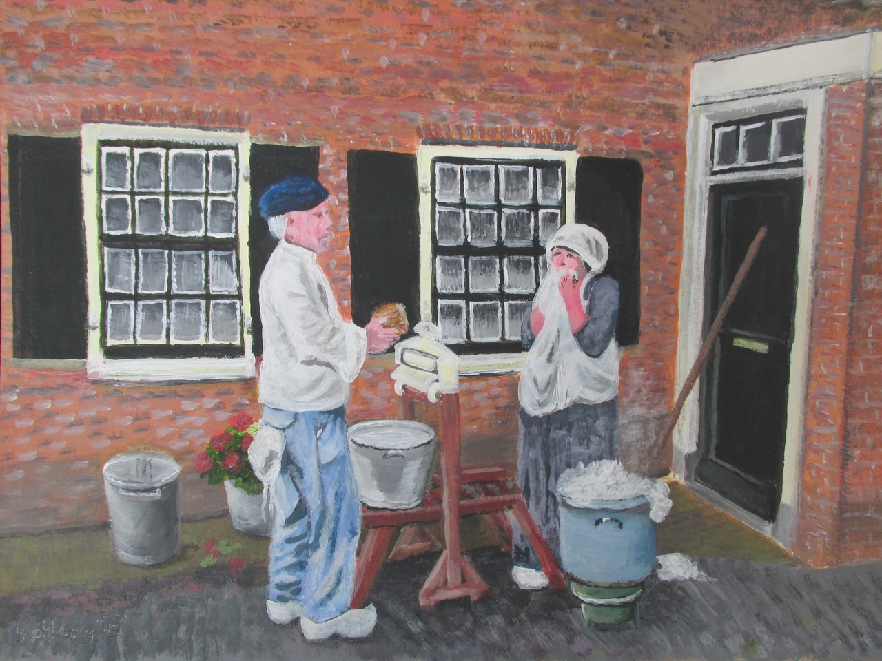 Linschoten 100 jaar terug in de tijd (+_ 1920) De bakker en de wasvrouw op het kerkplein. acryl op papier