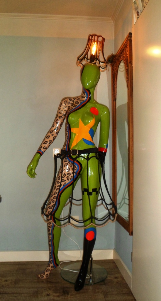 "Geen gezicht" is 200cm hoog en laat een sterke vrouw zien die zelf beslist wat haar visie is op fashion. Beschilderd en afgewerkt met een stevige vernislaag ter bescherming. Zowel hoedje als rok zijn gemaakt van een vintage lampenkap geraamte, onwikkeld met natuurlijk touw wat vervolgens gedeeltelijk geschilderd is.