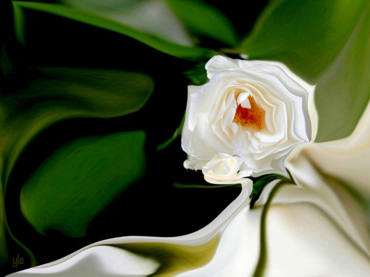 Witte roos is een zeer fijn uitegevoerd abstract in een groene ondergrond. De afbeelding is afgedrukt op plexiglas in het formaat 80x60cm.