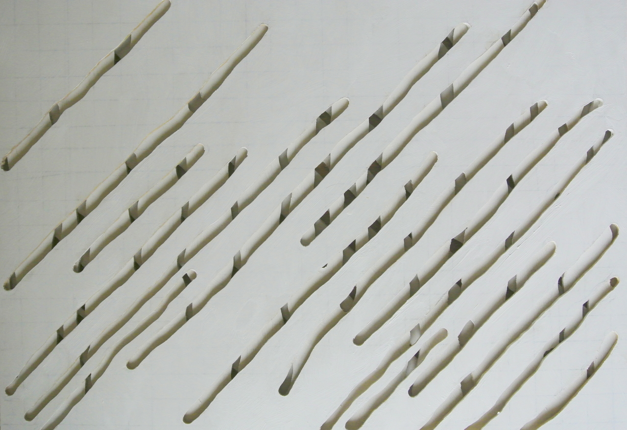 Het werken met strepen zoals in woordzoekers ben ik begonnen met een experiment door lijnen uit te zagen en over elkaar te plaatsen in een paneel