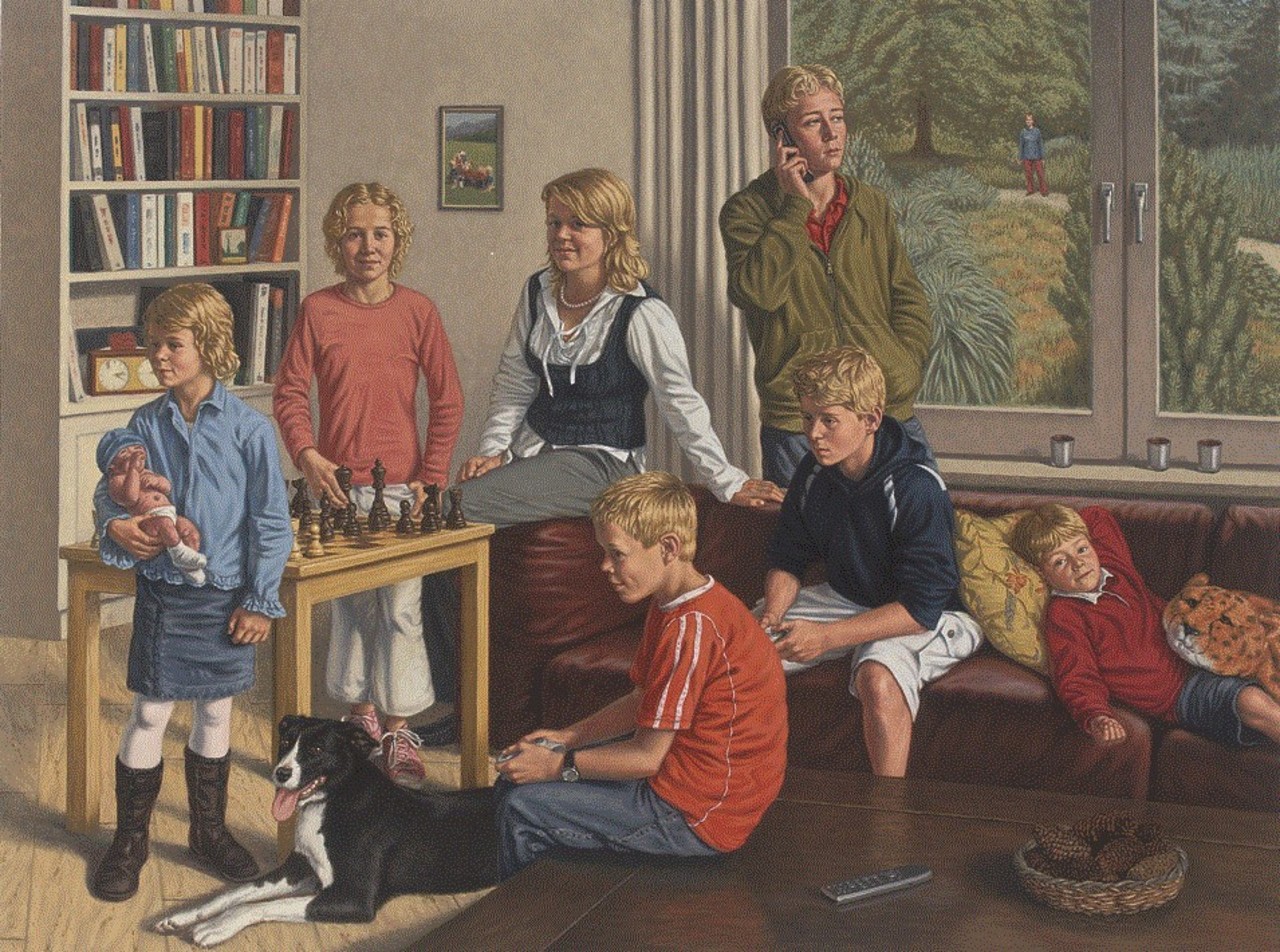 Groepsportret met als opdracht 7 kinderen en een hond in hun interieur.