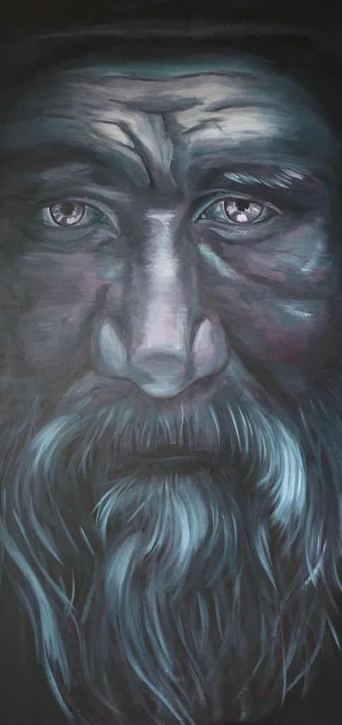 Oude man in het donker, opgebouwd uit blauw, groen, paars en zwart tinten. Olieverf op doek