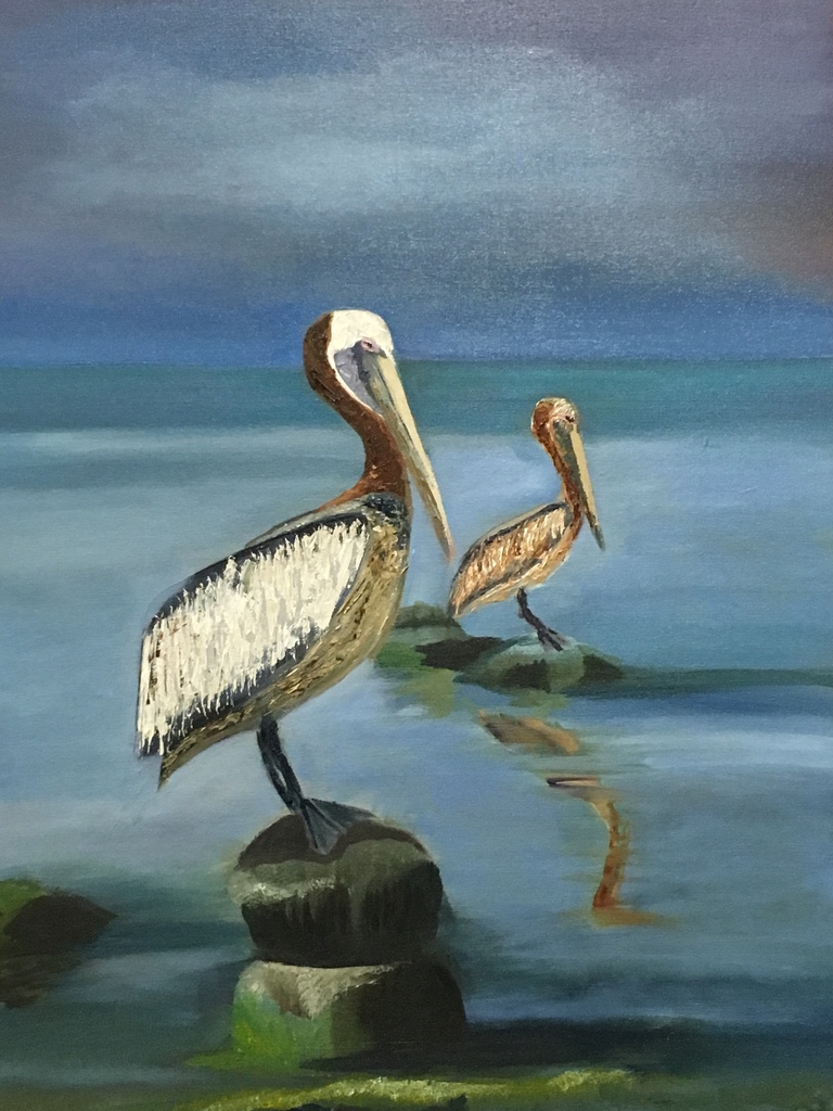 Twee pelikanen op rotsen in de zee. Olieverf op canvasboard, deels met mes.