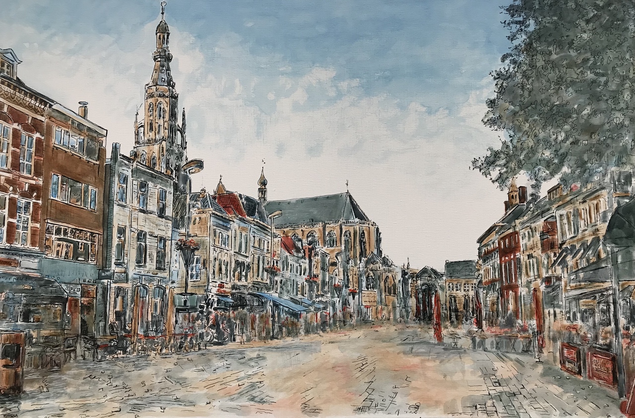 Inktschilderij Grote Markt Breda, linnen doek met aluminium frame 80x120 cm.