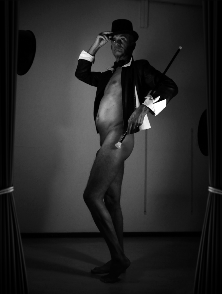 Wit Zwart Dans Man Naakt Lichaam Toneel Mannelijk Hoed Vroeger Ster Naakten Zang Podium Optreden Rook Zingen Instrument Trombone Cabaret Stage Strikje Rokerig Broeierig Obscure