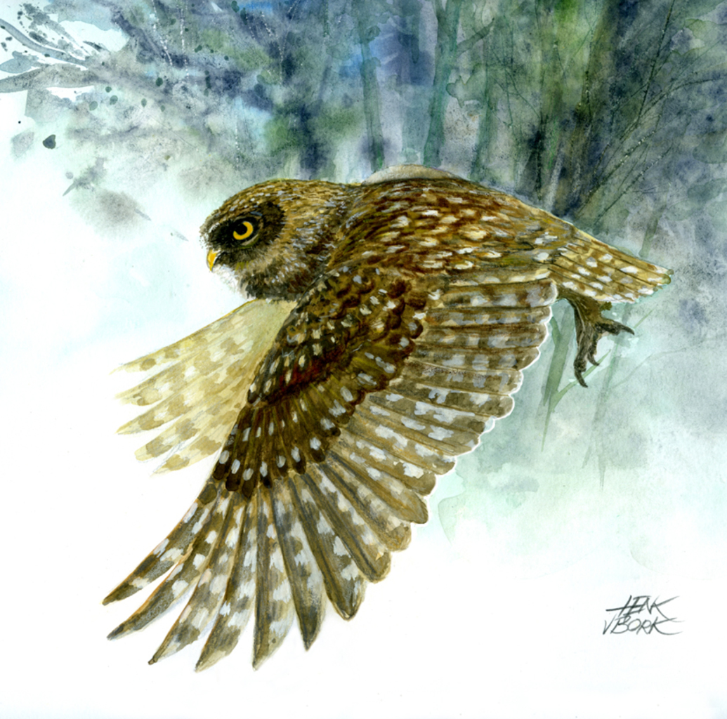 Steenuil op jacht in opdracht gemaakt voor jaaroverzicht vogels in 't Gooi.