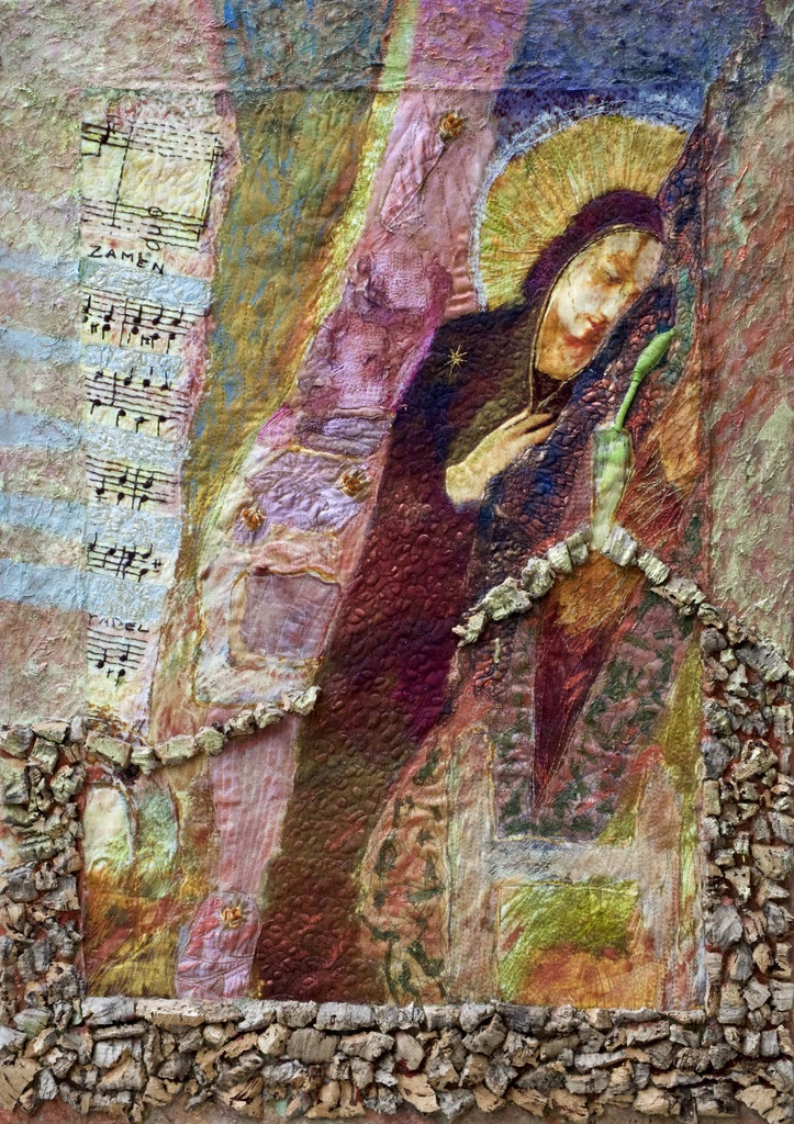 Jezus Verbeeld. Hij werd al aangekondigd als een nieuwe loot in het geslacht van David Een twijg zal ontspruiten aan de stronk van Isaï (profetie uit Jesaja 11:1). Mixed media, textiel, stikwerk, fotografie, kurkeikbast