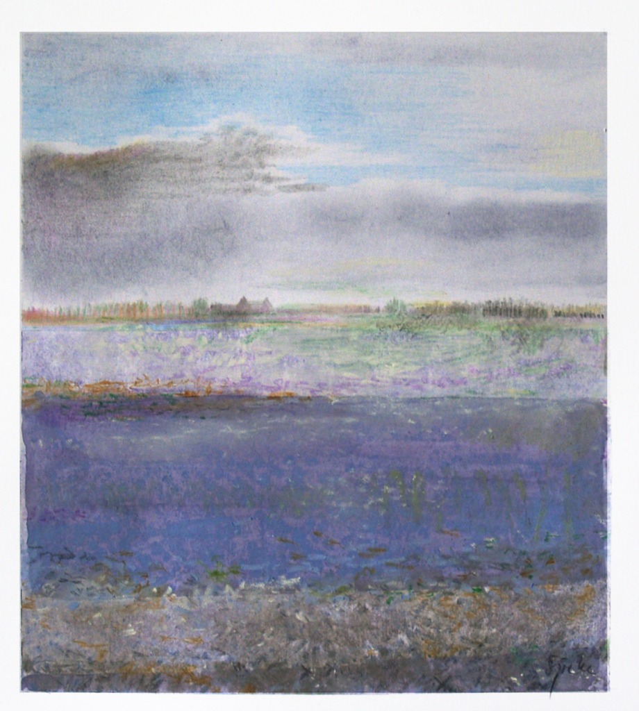 Glinsterende klei vòòr de dijk Tekening op gedeelte papier; brede open rand