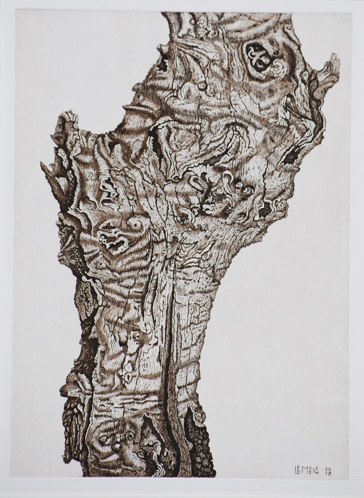 Deze oude knoteiken stronk, geheel verweerd, alleen de harde kern is er nog en toont nu allerlei prachtige vormen. Geweldig om te tekenen en te etsen.