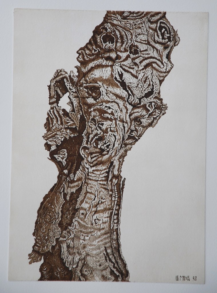 Deze oude Knoteikenstronk is geheel verweerd en toont nu allerlei prachtige vormen. Geweldig om te tekenen en te etsen.