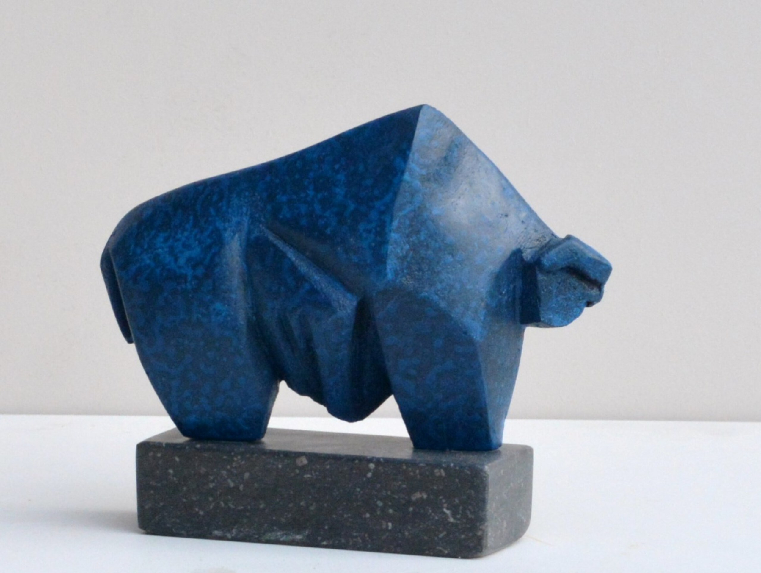 Een klein stiertje met veel beweging in het lijf . Strakke vorm . Massief gegoten in kunsthars . Kleur blauw/zwart. Geplaatst op een hardstenen sokkel. Te zien bij Ton Schulten galerie Ootmarsum