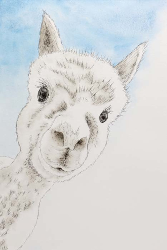 Deze alpaca is een combinatie van aquarelverf en houtskool. Op deze manier heeft het iets weg van een tekening uit een kinderboekje. Zijn zachte vacht en grote ogen geven hem een schattig uiterlijk. Ideaal als schilderij voor in de kinderkamer! Er zijn nog twee soortgelijke schilderijen namelijk 'Het Tevreden Varken' en 'De Blije Struisvogel'.