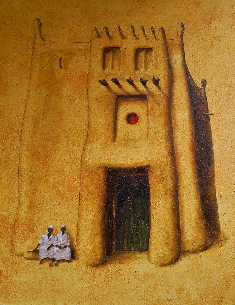 Een lemen gebouw in Djenné, Mali. Acryl/zand op doek.
