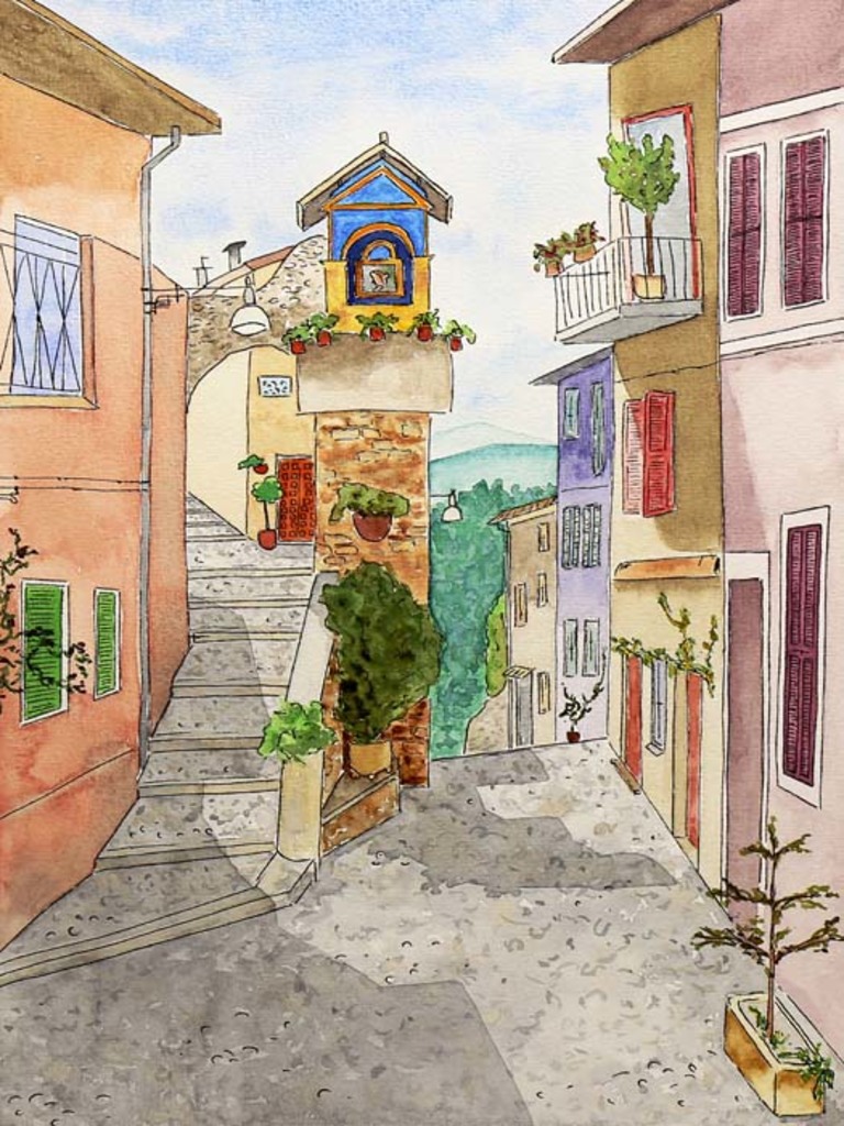 De kleurrijke straten van Italië met karakteristieke steegjes en mooie berglandschappen. De Louvre luikjes , balkons en potten gevuld met bloemen horen daar ook echt bij. De heldere kleuren geven het schilderij een vrolijke uitstraling. Het schilderij is een combinatie van aquarelverf en inkt.