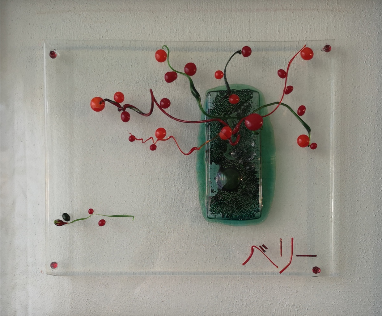 Takjes met bessen in groene vaas. Zelfgetrokken strengen glas met rode en oranje glasbessen. Koud fuse op een plaat helder glas. Gezet in zwarte lijst