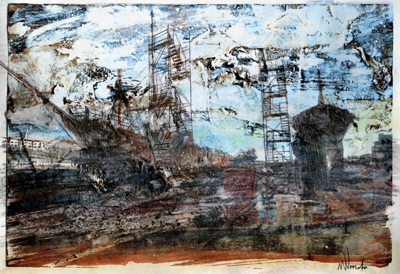 Grafische kunst op Dibond Acryl, diverse tekentechnieken en fotobewerkingen Voor dit kunstwerk heb ik een foto gebruikt van een scheepswerf in Kaapstad.