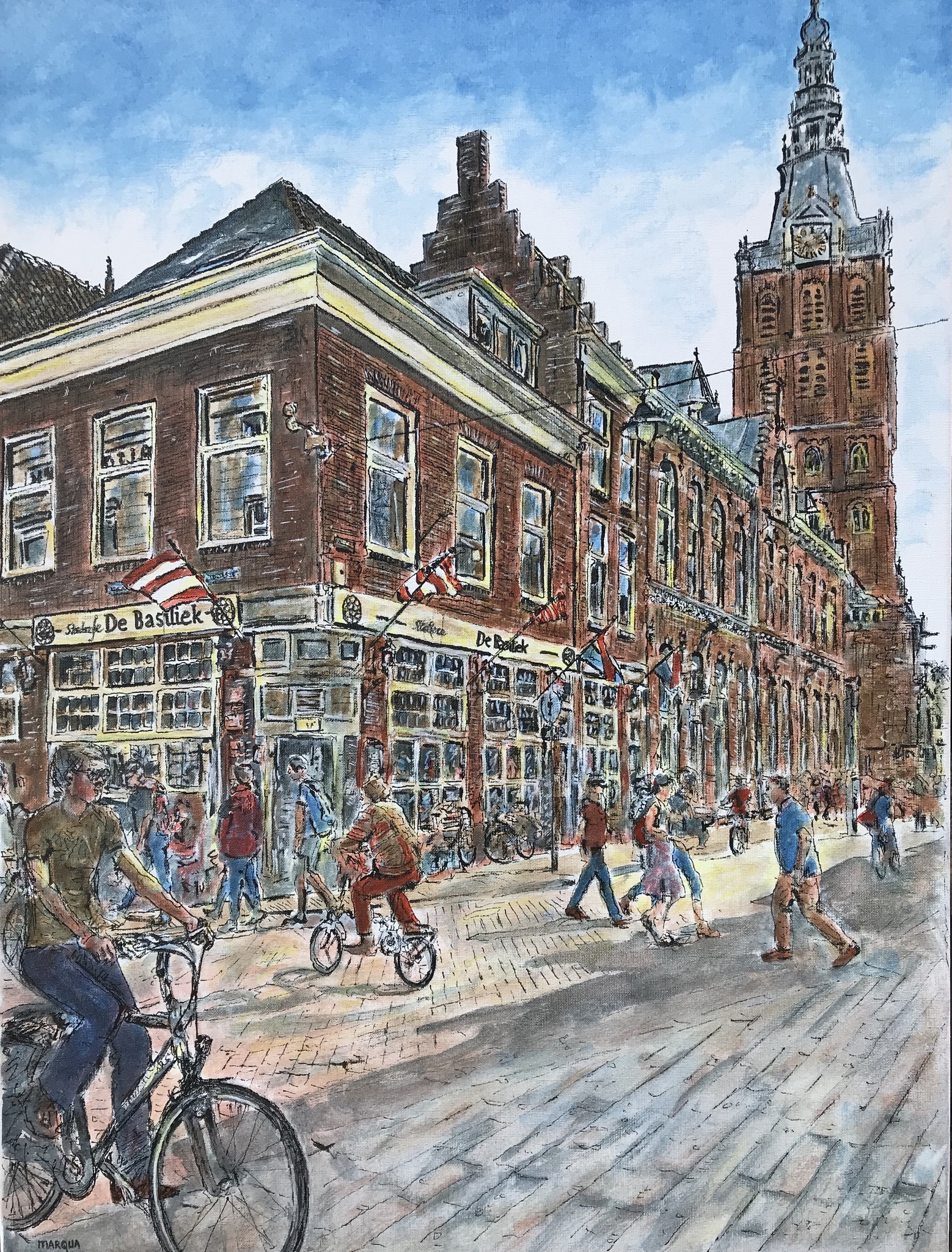 Café de Basiliek en de Sint Jan, Torenstraat. Getekend en geschilderd met rietpen en penseel in Oost-Indische en meerdere kleuren inkt op linnen doek 60x80 cm.